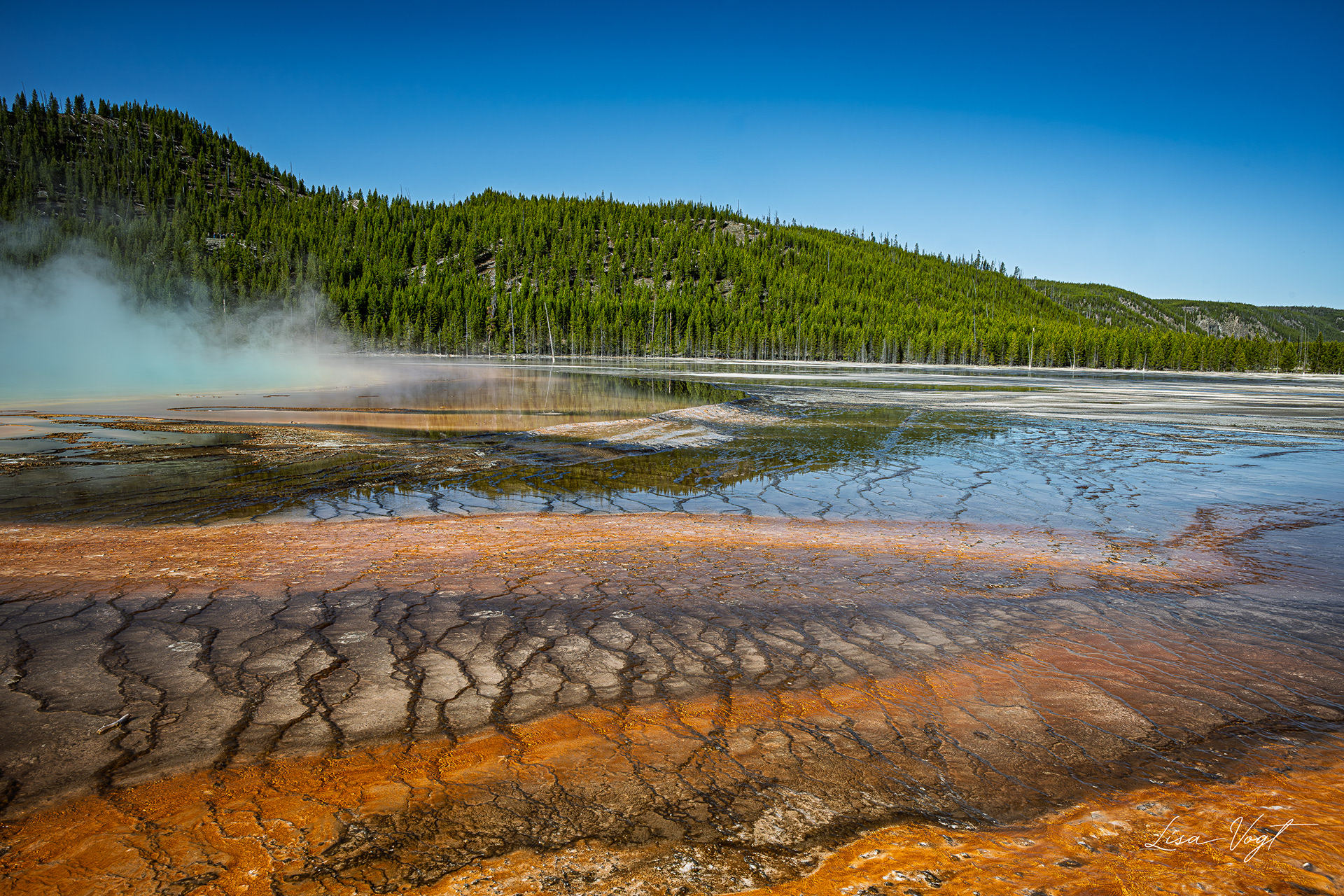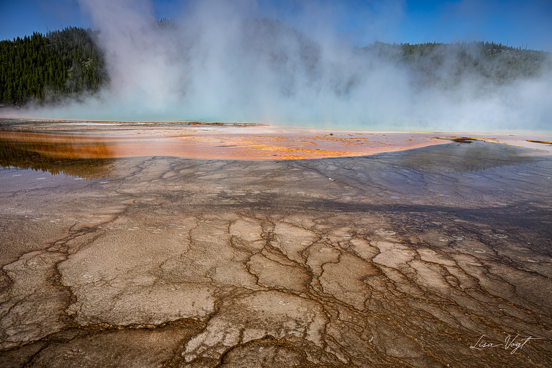Grand Prismatic Spring, Yellowstone National Park, Wyoming. See the bison foot prints in the mud.